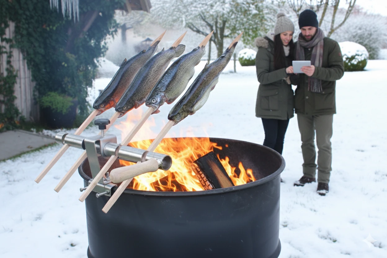 Die aromatische Marinade - meist aus Öl, Salz, Knoblauch, Paprika und Kräutern - schützt den Fisch vor dem Austrocknen und verleiht die typische goldbraune würzige Haut. Entscheidend ist die Kombination aus indirekter Hitze und richtiger Stellung, die für ein gleichmäßiges Rösten sorgt.